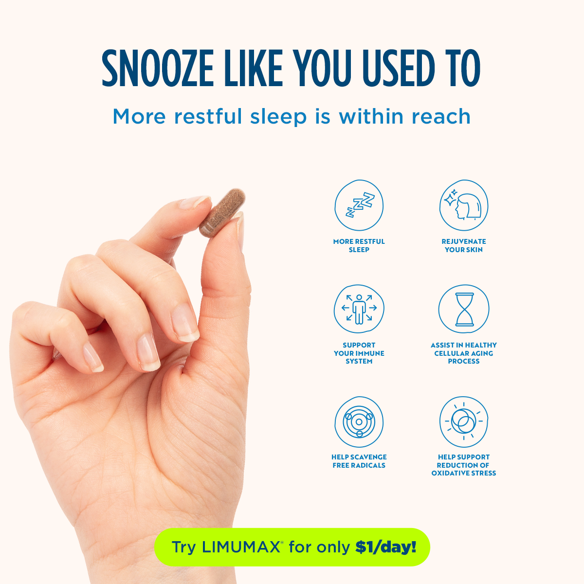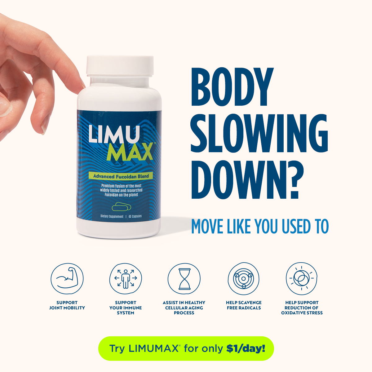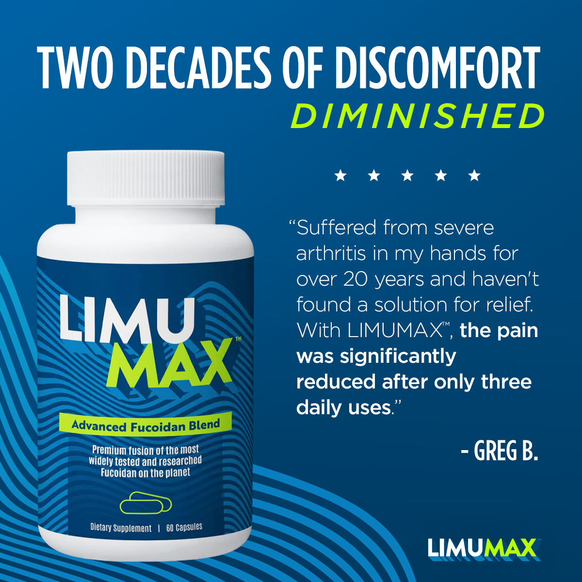 LIMUMAX® is power-packed nutrition in convenient caps. You already know your health is your wealth. And if you’ve been struggling with various health issues, you also know you’ll never be able to fully enjoy and cherish life to its fullest. But here’s the good news — it doesn't matter whether you’ve just started seeking solutions for your health issues, or you’ve been fighting for 10, 20, or even 30 years and have yet to find effective relief, your health concerns — literally all of them — can be improved with LIMUMAX. Each bottle has a 60-day supply (if used by one person only). Order multiple bottles for significant savings.